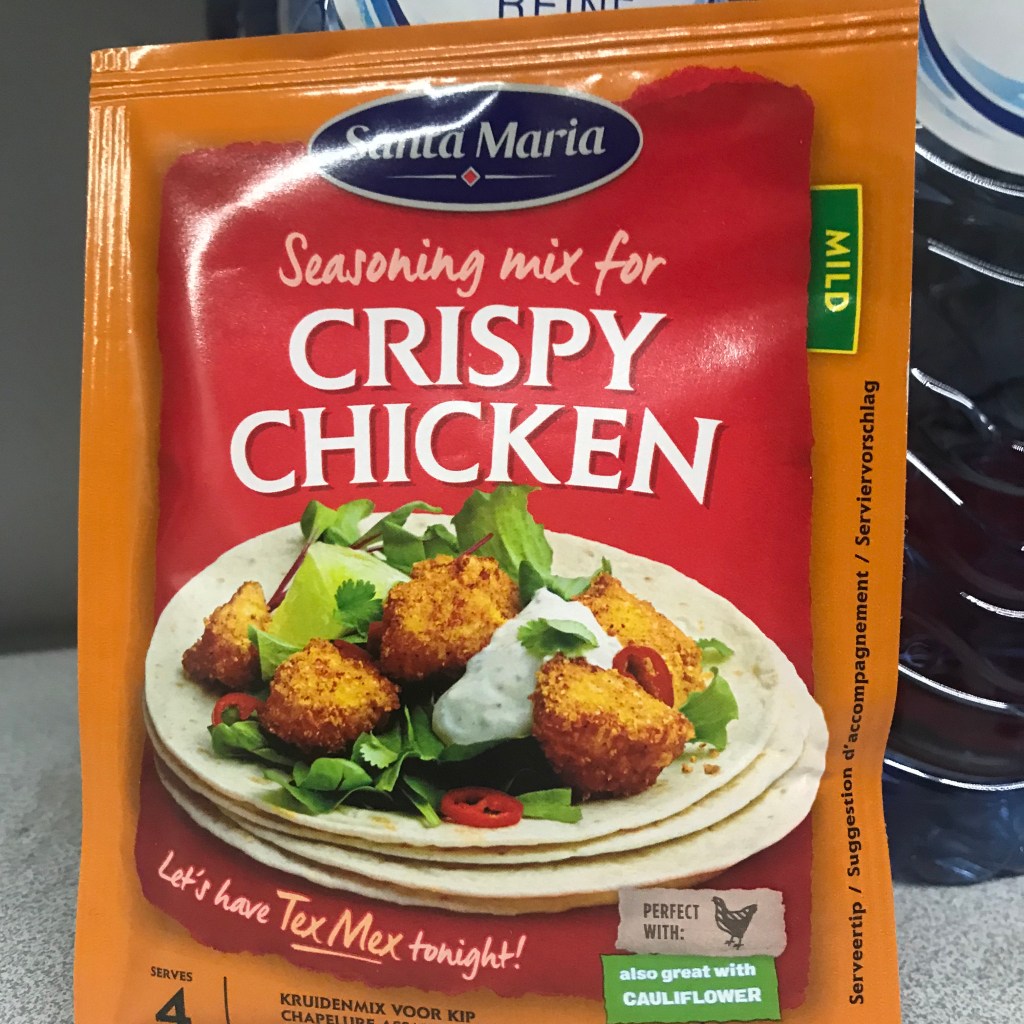 Non food benodigdheden - plastieken / ziploc zakje - beetje olijf (of andere) olie - bakplaat bedekt met bakpapier - voorverwarmde oven op 225° Voor de bereiding - 500gr versneden kipfilet - pakje crispy chicken mix (zie afbeelding) Steek kipstukjes in ziploc (of ander sluitbaar) zakje Strooi de mix erbij Voeg 1 soeplepel olie in het zakje en sluit zakje af Meng alles tot als de mix volledig rond de kipstukjes kleeft (héél goed mengen) Verdeel kipstukjes met mix op bakplaat Plaats 15 minuten in opgewarmde oven KLAAR