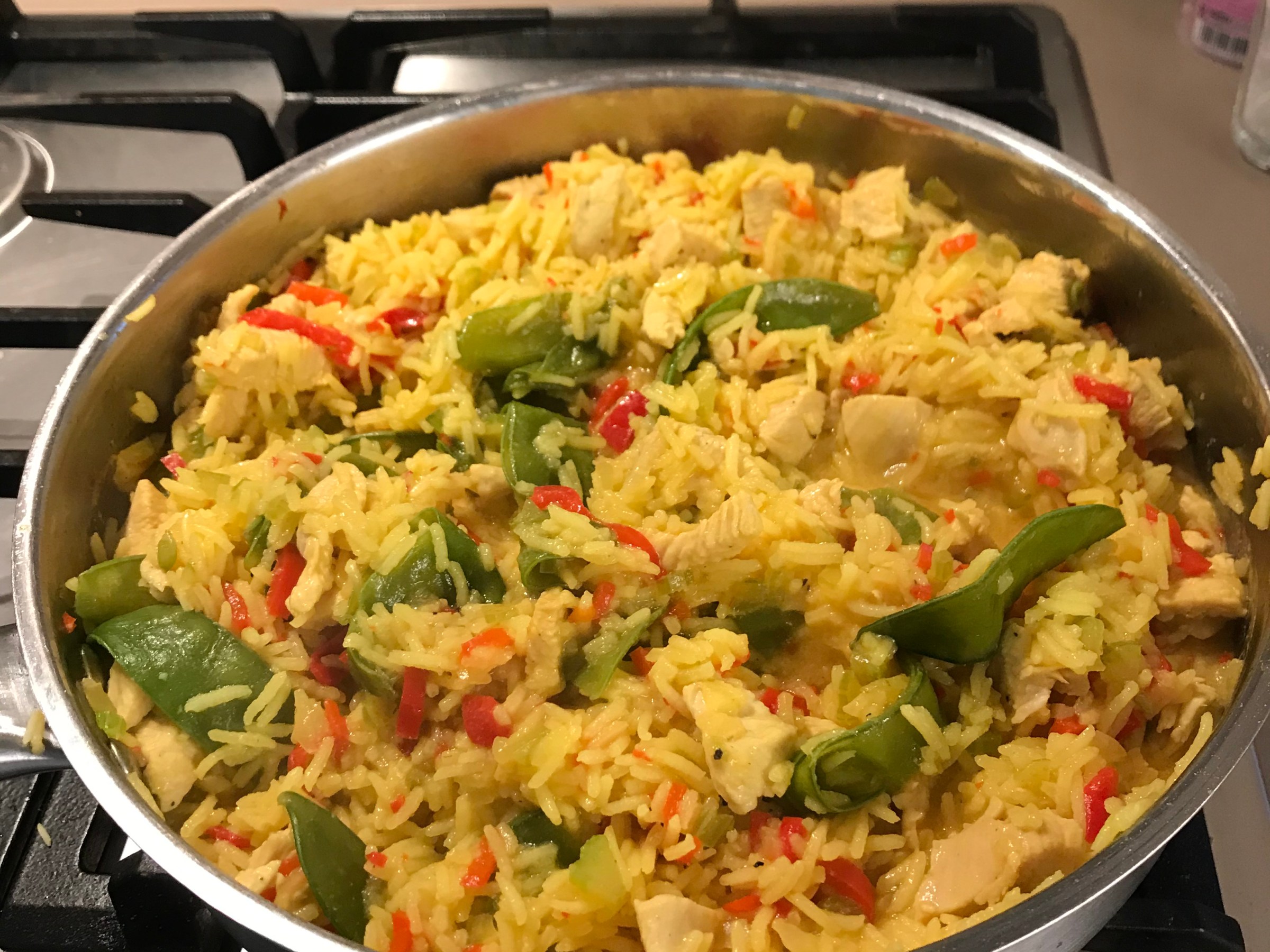Wat zit er nog in de ijskast op het einde vd week? Dit recept kan met verschillende kleine hoeveelheden groenten gemaakt worden en iedere keer anders smaken. Deze versie heeft als groenten: - zoete paprika (naar smaak) - 2 selderstokken - sluimererwten - 2 rode pepers (piment) - 1 ajuin Andere ingrediënten - 2 pakjes rijst (1 voor 2 personen) of losse rijst (4 cups) - 2 capsules saffraan (kan weggelaten worden) - 4 kipfilets (1 per persoon) - 2 blokjes kipbouillon opgelost in heet water - wat vetstof - peper/zout/cayenne naar smaak Bereiding - kook de sluimererwten 5min apart - was en snij alle groenten fijn - snij de kip in kleine stukjes - fruit de ajuin in wat vetstof - snij de zakjes rijst open en verdeel over de ajuin - blijf roeren tot rijst glazig wordt - voeg saffraan toe aan de opgeloste kippenbouillon (geeft gele kleur aan gerecht en beetje rokerige smaak - niet pikant) - voeg klein beetje bouillon aan rijst en ajuin toe zodat deze niet kleven - voeg kip toe en laat aan alle kanten 'wit' worden - kruid naar smaak met peper/zout/cayenne - voeg alle voorgesneden groenten toe - roer alles goed en voeg 1/3 van de bouillon toe. Laat wat inkoken. Als vocht bijna is opgenomen, blijf je bouillon bijvoegen. - Blijf regelmatig alles goed omroeren, vermijdt dat er iets aan de bodem blijft plakken - Bouillon gaat rijst doen zwellen, als alles goed is opgenomen is rijst klaar (proeven!) - Schotel is klaar op ongeveer 20min