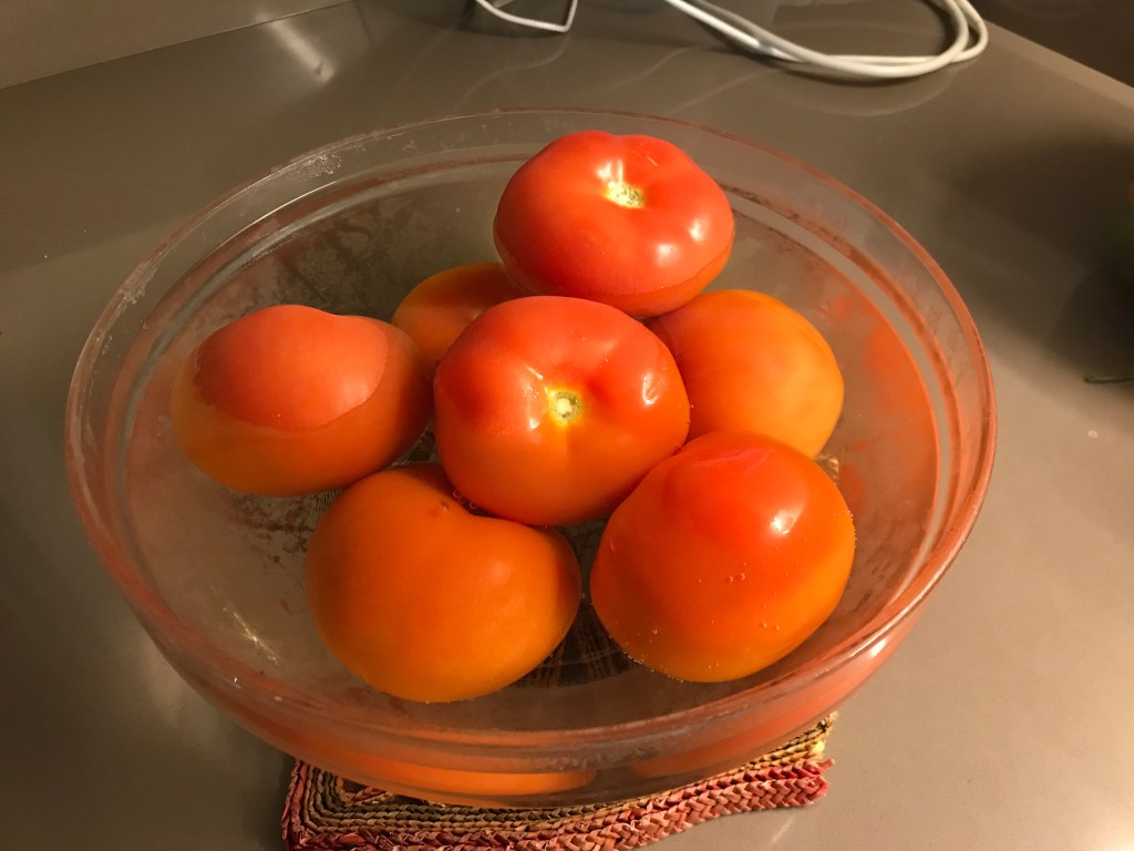 - Leg tomaten in kokend water tot als vel loskomt en pel alle tomaten
