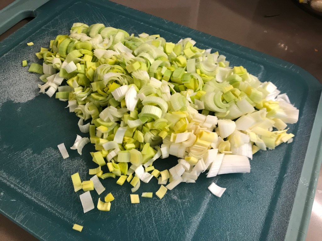 - Snij ajuin, aardappel en prei in kleine stukken